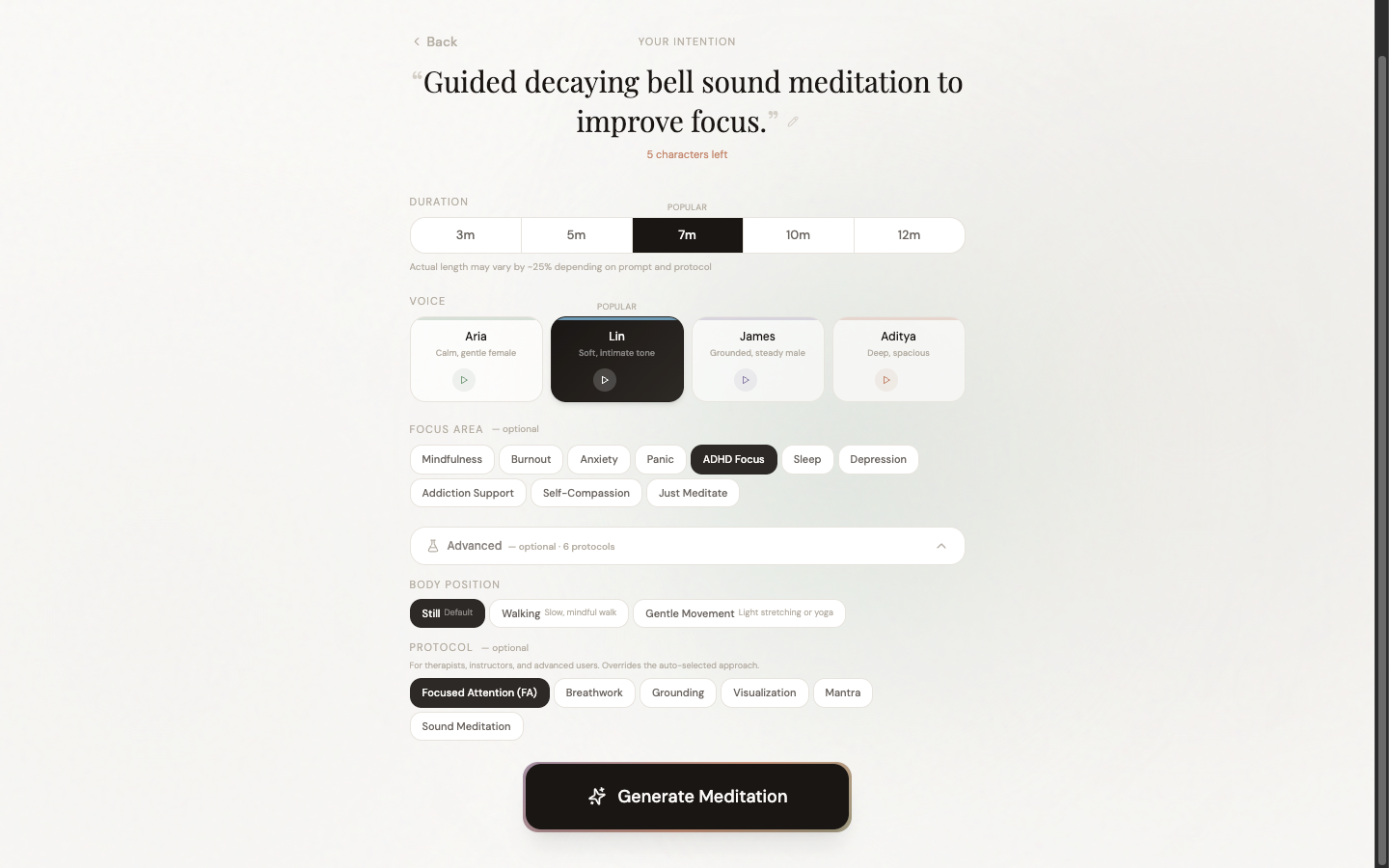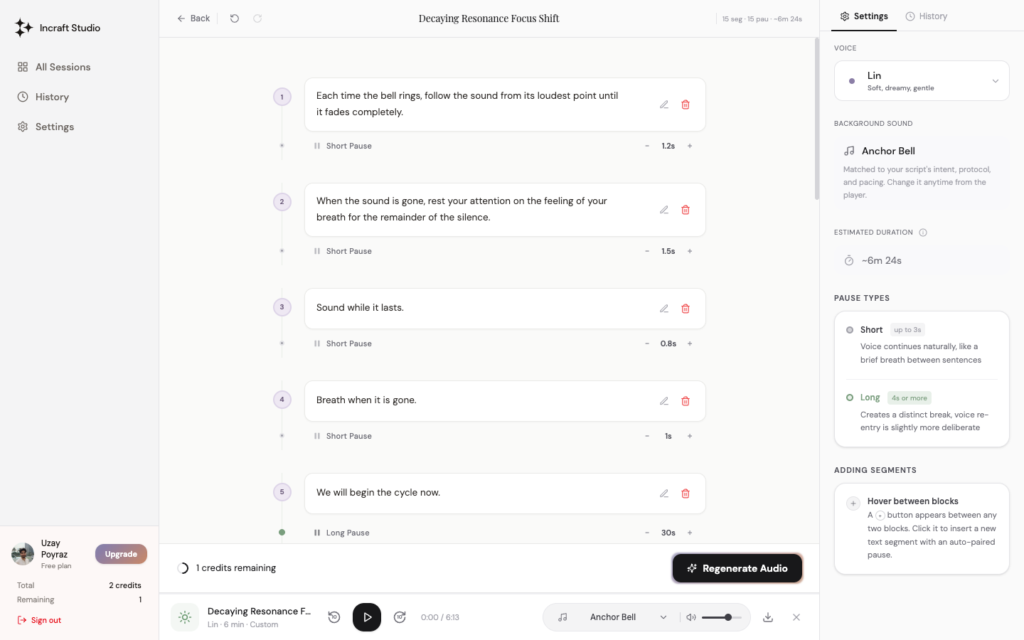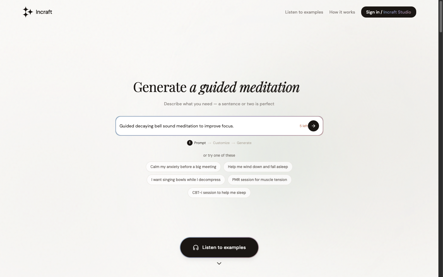 I built Incraft after realizing parts of the pipeline behind Neurotype could be optimized to deliver studio-quality, voiced sessions in under a minute. With Incraft, you describe what you're going through and it generates a complete guided meditation or CBT session tailored to that moment, automatically selecting the protocols and structure that fit best. For therapists, creators, and instructors, that same prompt-based generation can be steered much more explicitly - sessions can be shaped with ~50 evidence-based protocols like CBT, PMR, and urge surfing, each with its own pacing rules, safety constraints, and structure. The studio adds even finer control for crafting sessions for specific patients, clients, or audiences.